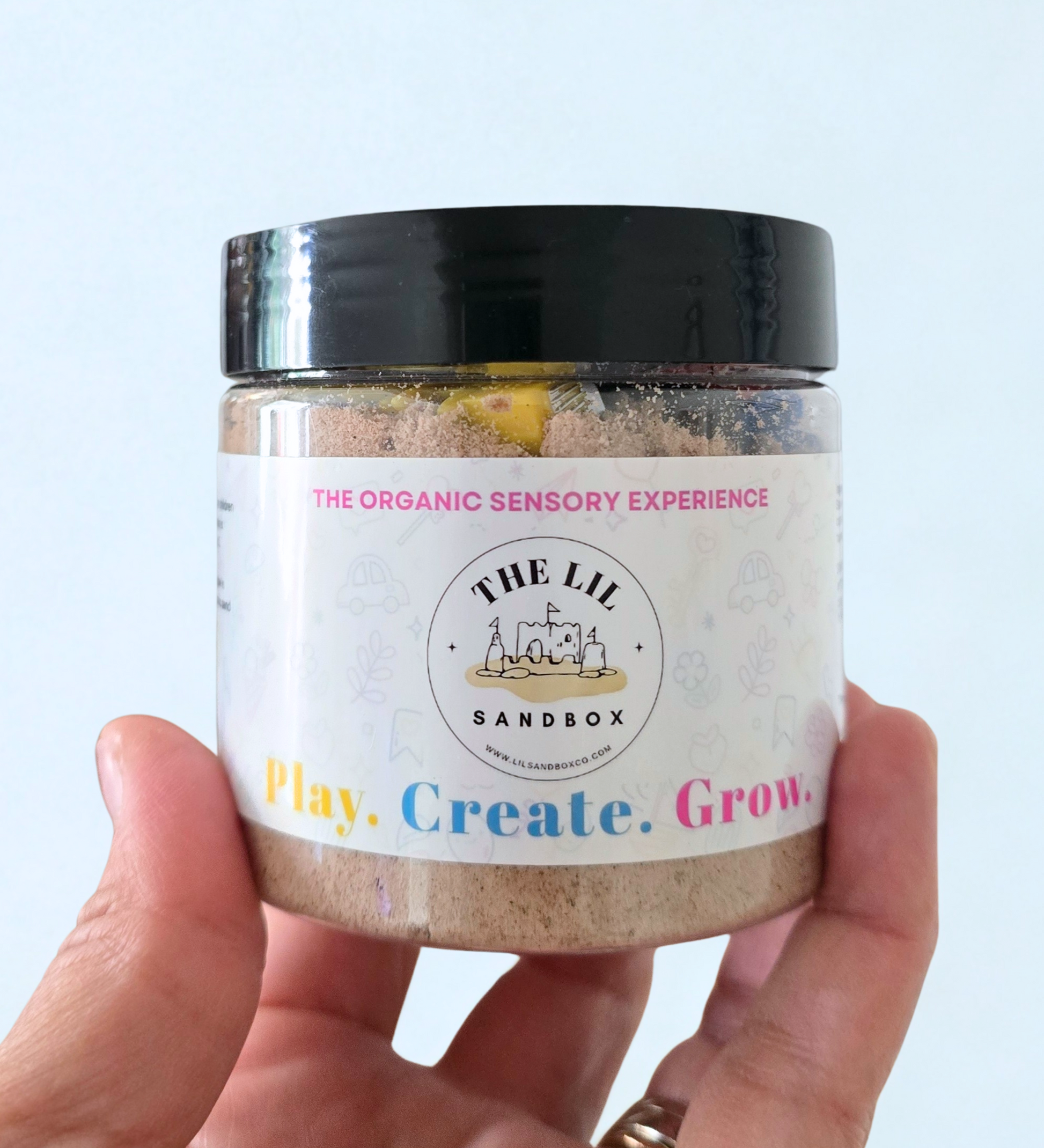 The Lil Sandbox Co 8oz organic sensory sand jar kit is perfect for party favors, at home play or on the go.